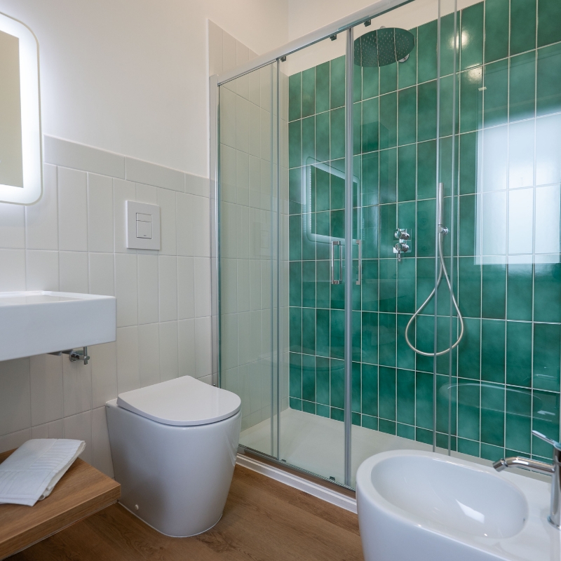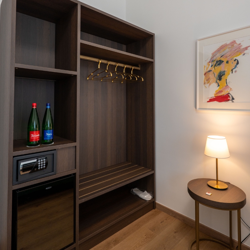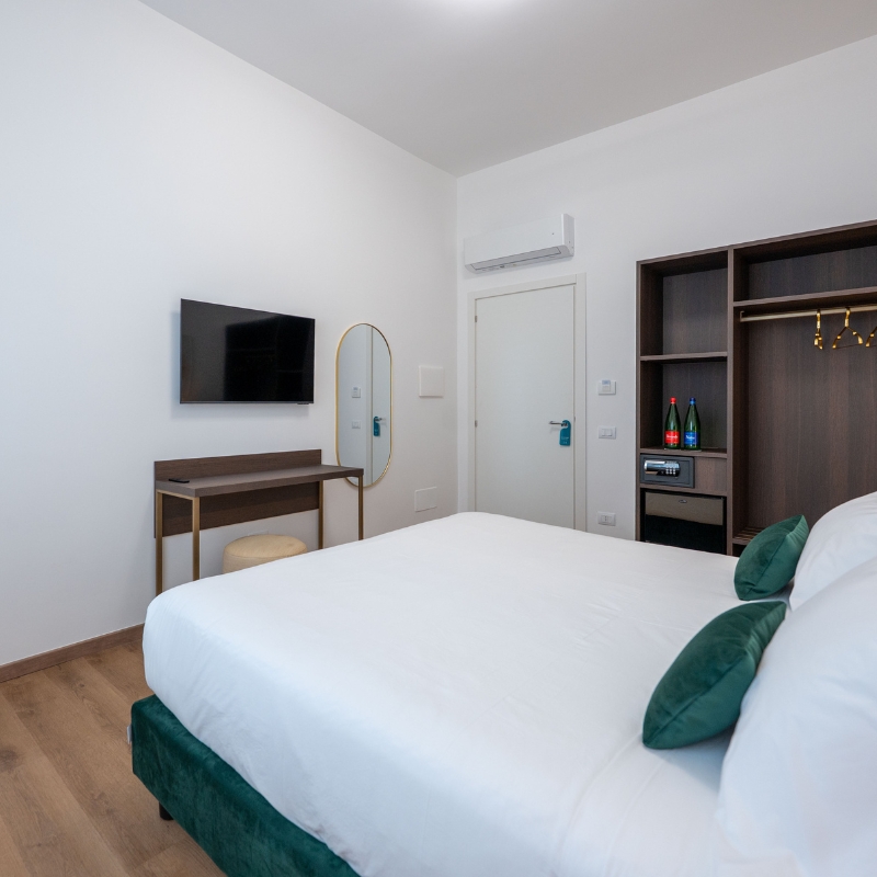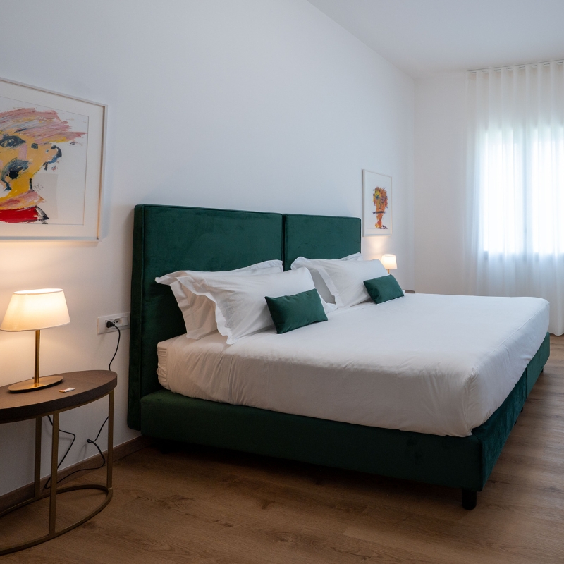 Nelle camere con balcone o porticato, le vetrate scorrevoli favoriscono il dialogo tra interno ed esterno, aggiungendo un ulteriore senso di apertura e continuità.